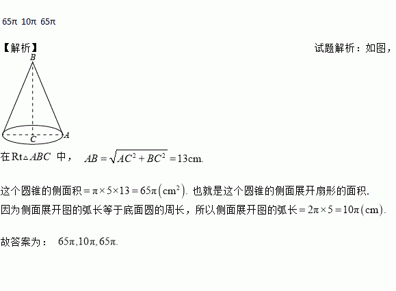 已知Rt△ABC的两直角边AC=5 cm,BC=12 cm,则以BC为轴旋转所得的圆锥的侧面积为__________ cm2,这个圆锥的侧面展开图的弧长为__________ cm,面积为___________ cm2.