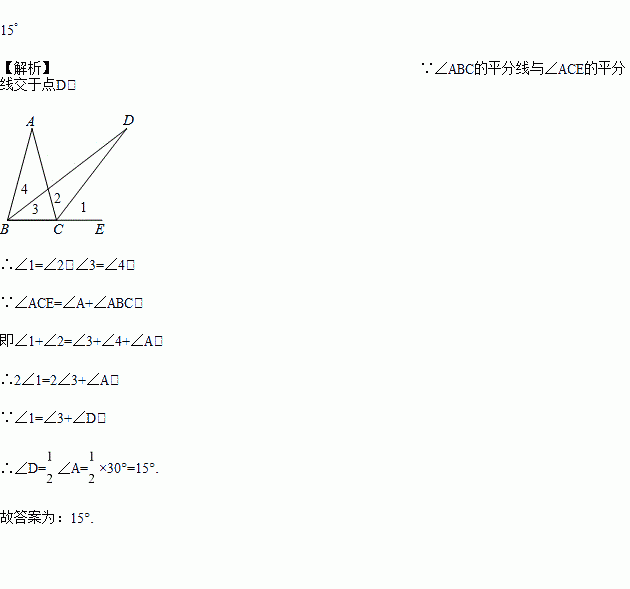 如图,在△ABC中,AB=AC,∠A=30°,E为BC延长线上一点,∠ABC与∠ACE的平分线相交于点D,则∠D等于__________