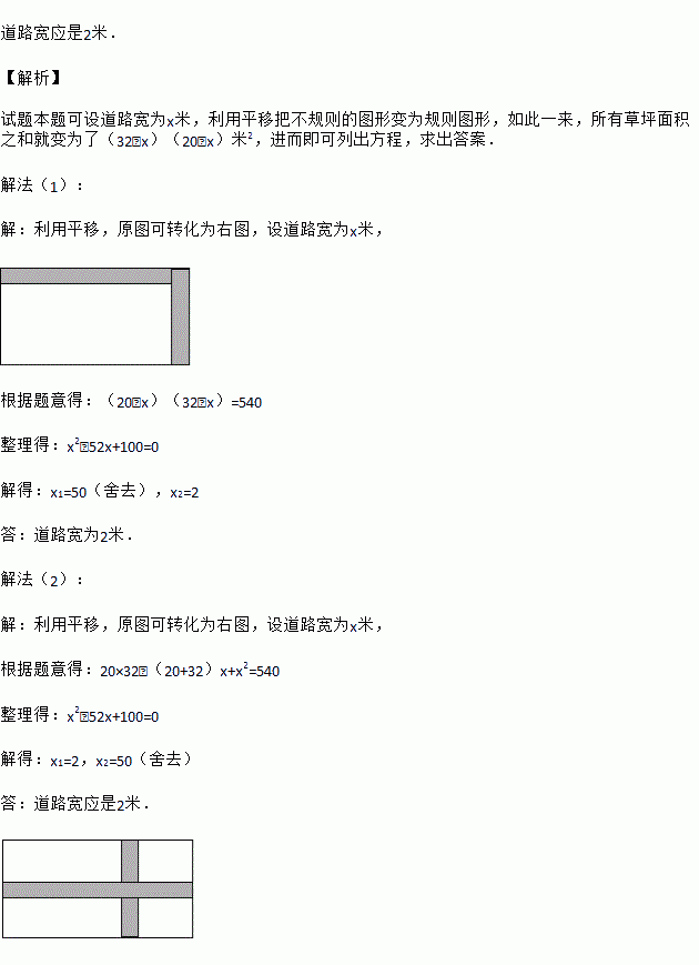 如图,在宽为20m,长为32m的矩形地面上修筑同样宽的道路图中阴影部分,余下的部分种上草坪要使草坪的面积为,求道路的宽.