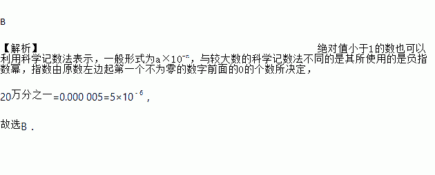 新亚商城春节期间,开设一种摸奖游戏,中一等奖的机会为20万分之一,用科学记数法表示为( )