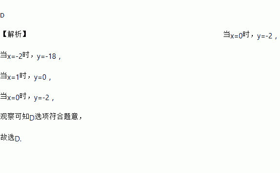 D 【解析】当x=0时,y=-2, 当x=-2时,y=-18, 当x=1时,y=0, 当x=0时,y=-2, 观察可知D选项符合题意, 故选D.