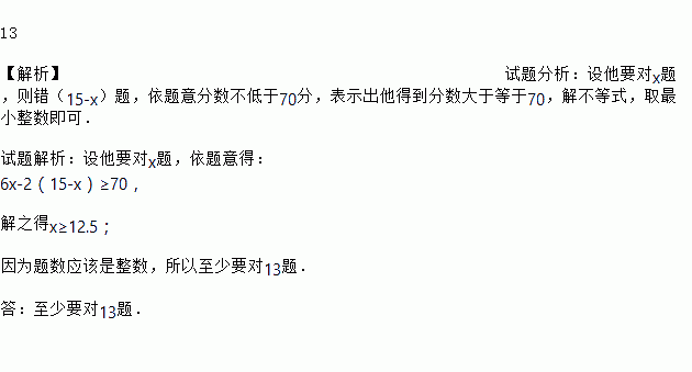 某次数学测验,共16个选择题,评分标准为:;对一题给6分,错一题扣2分,不答不给分。某个学生有1题未答,他想自己的分数不低于70分,他至少要对多少题?