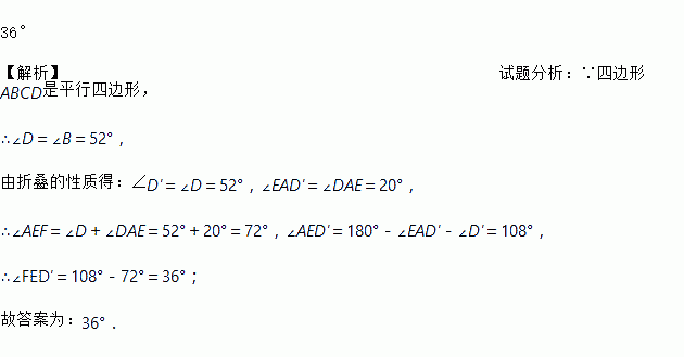 如图,在?ABCD中,E为边CD上一点,将△ADE沿AE折叠至△AD′E处,AD′与CE交于点F.若∠B=52°,∠DAE=20°,则∠FED′的大小为________.