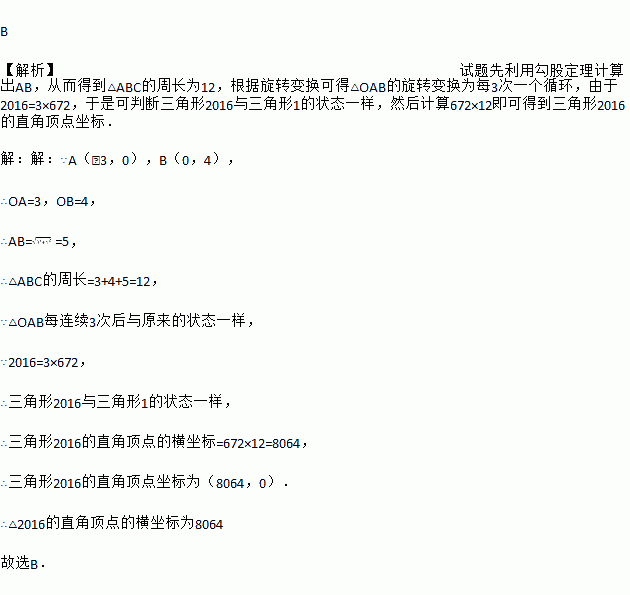 如图,在直角坐标系中,已知点A(-3,0)、B(0,4),对△OAB连续作旋转变换,依次得到△1、△2、△3、△4…,则△2016的直角顶点的坐标为 ( )