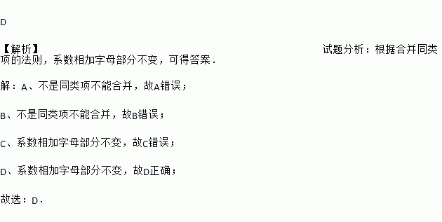 D 【解析】试题分析:根据合并同类项的法则,系数相加字母部分不变,可得答案. 【解析】 A、不是同类项不能合并,故A错误; B、不是同类项不能合并,故B错误; C、系数相加字母部分不变,故C错误; D、系数相加字母部分不变,故D正确; 故选:D.