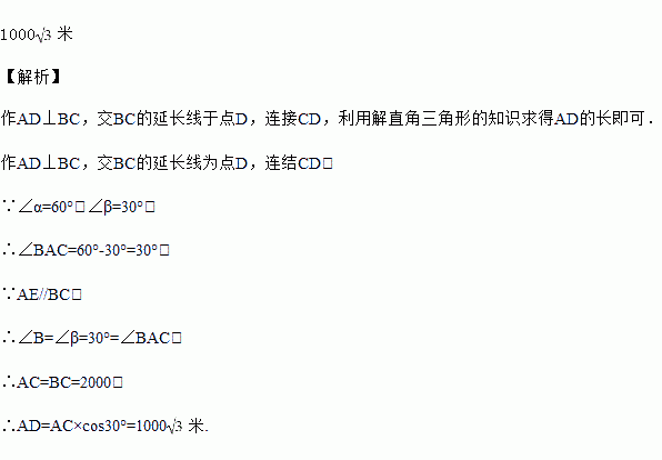 如图,一架满载救援物资的飞机到达灾区的上空,在A处测到空投地点C的俯角α=60°,测到地面指挥台β的俯角=30°,已知BC的距离是2000米,求此时飞机的高度(结果保留根号)。