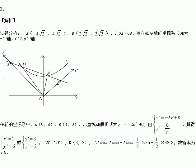 如图,曲线l是由函数在第一象限内的图象绕坐标原点O逆时针旋转45°得到的,过点A(,),B(,)的直线与曲线l相交于点M、N,则△OMN的面积为 .