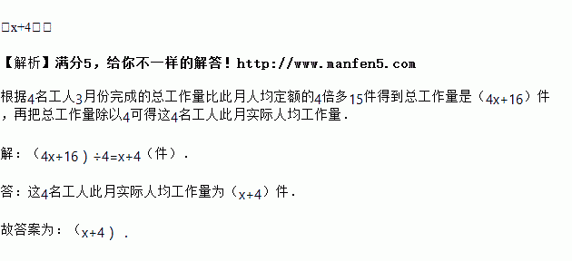 某4名工人3月份完成的总工作量比此月人均定额的4倍多16件,如果设此月人均定额是x件,那么这4名工人此月实际人均工作量为_____件.(用含x的式子表示)