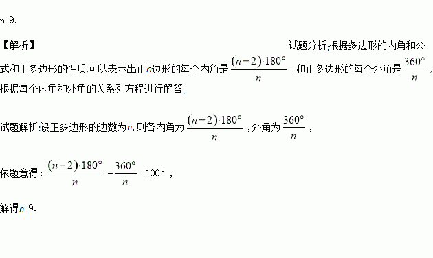 某正多边形的每个内角比其外角大100°,求这个正多边形的边数.