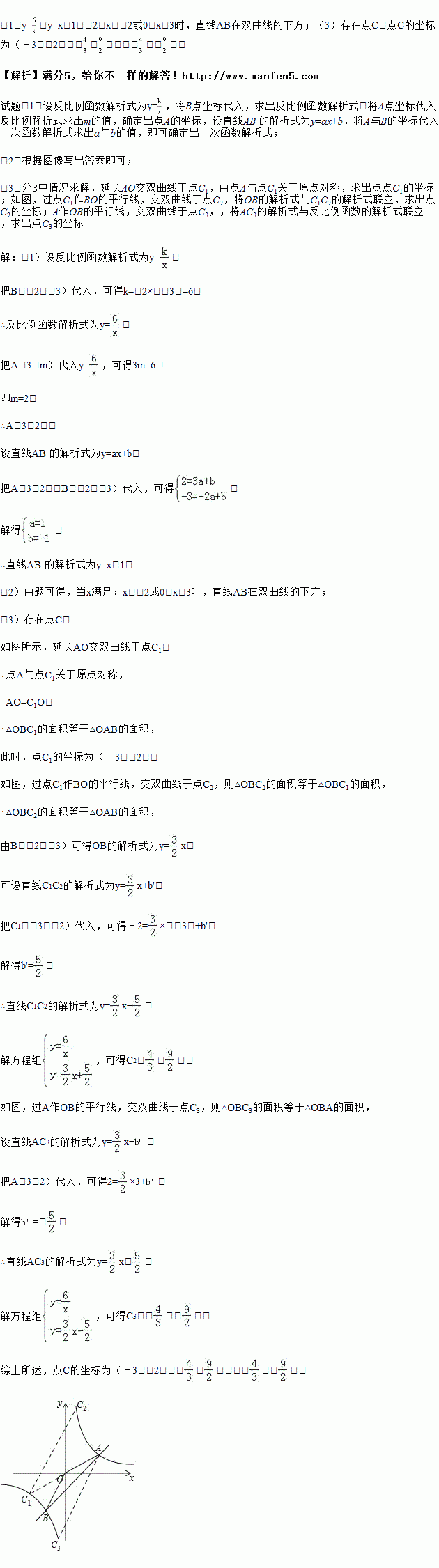 (3)反比例函数的图象上是否存在点C,使得△OBC的面积等于△OAB的面积?如果不存在,说明理由;如果存在,求出满足条件的所有点C的坐标.