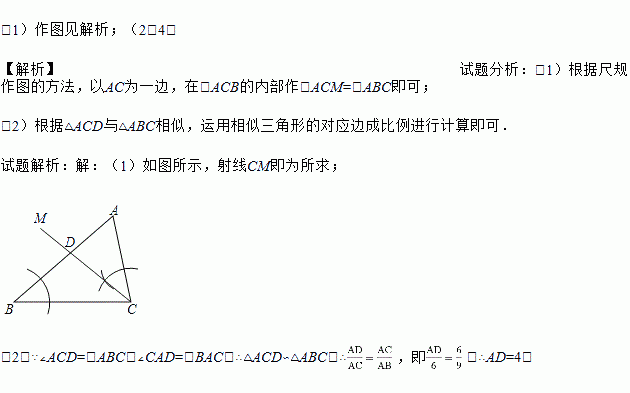 (2)若(1)中的射线CM交AB于点D,AB=9,AC=6,求AD的长.