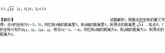 如图,在平面直角坐标系中,已知正方形网格的格点A的坐标为(-3,5),则它到x轴的距离是_____,到y轴的距离是_ __,到原点的距离是_____.格点B,C的坐标分别为B_____,C_____.若点D(-3,-4),则它到x轴的距离为_____,到y轴的距离为____,到原点的距离为__.