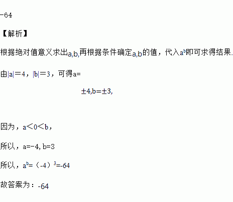 若|a|=4,|b|=3,且a<0<b,则ab的值为_______.