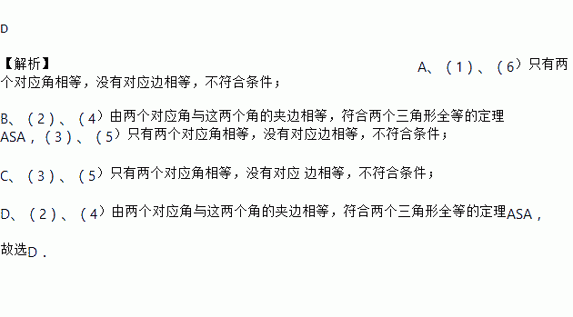 D 【解析】A、(1)、(6)只有两个对应角相等,没有对应边相等,不符合条件; B、(2)、(4)由两个对应角与这两个角的夹边相等,符合两个三角形全等的定理ASA,(3)、(5)只有两个对应角相等,没有对应边相等,不符合条件; C、(3)、(5)只有两个对应角相等,没有对应 边相等,不符合条件; D、(2)、(4)由两个对应角与这两个角的夹边相等,符合两个三角形全等的定理A...