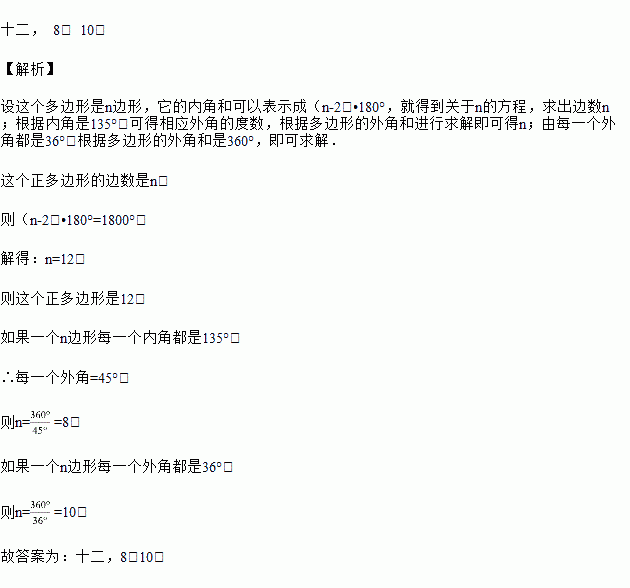如果一个多边形的内角和等于1800°,则这个多边形是_____边形;如果一个n边形每一个内角都是135°,则n=_____;如果一个n边形每一个外角都是36°,则n=_____.