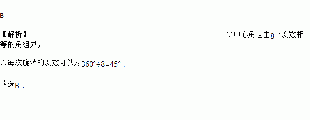B 【解析】∵中心角是由8个度数相等的角组成, ∴每次旋转的度数可以为360°÷8=45°, 故选B.