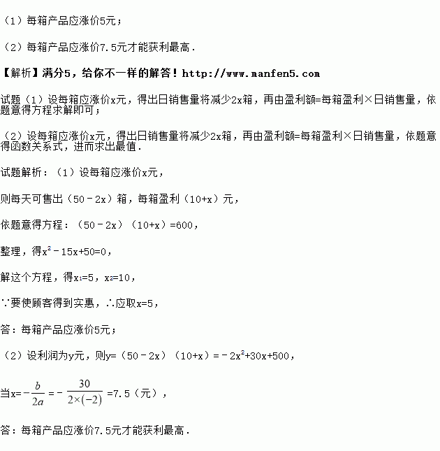 (1)现该销售点每天盈利600元,同时又要顾客得到实惠,那么每箱产品应涨价多少元?