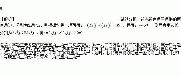 直角三角形中,两直角边的比是2:3,且斜边长为,则其面积为_________。
