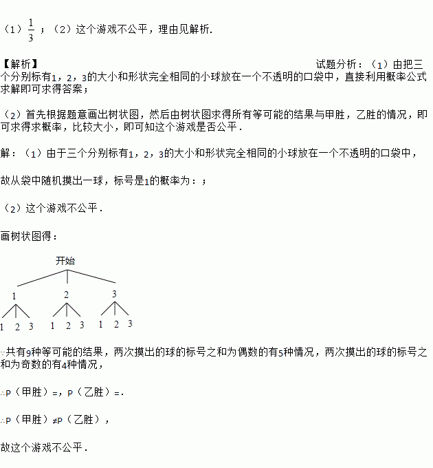 (2)从袋中随机摸出一球后放回,摇匀后再随机摸出一球,若两次摸出的球的标号之和为偶数时,则甲胜;若两次摸出的球的标号之和为奇数时,则乙胜;试分析这个游戏是否公平?请说明理由.