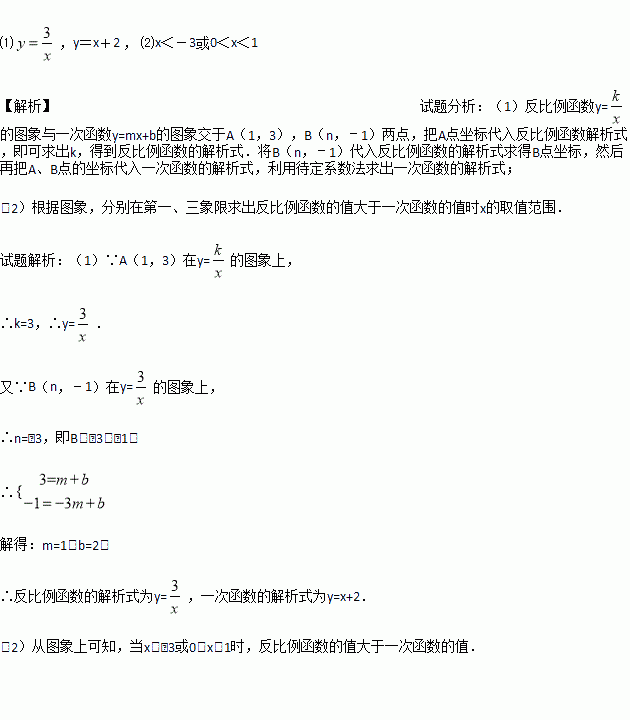 如图,反比例函数的图象与一次函数y=mx+b的图象交于A(1,3),B(n,-1)两点.