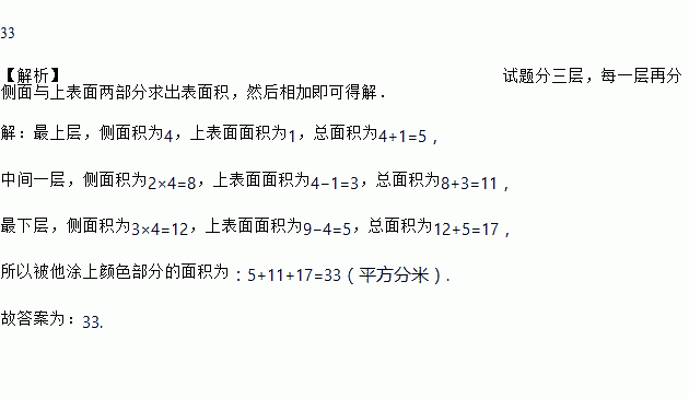 一位美术老师在课堂上进行立体模型素描教学时,把14个棱长为1分米的正方体摆在课桌上成如图形式,然后他把露出的表面都涂上不同的颜色,则被他涂上颜色部分的面积为_________平方分米.