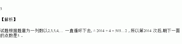有一个正六面体骰子,放在桌面上,将骰子沿如图所示的顺时针方向滚动,每滚动90°算一次,则滚动第2014次后,骰子朝下一面的点数是___________.