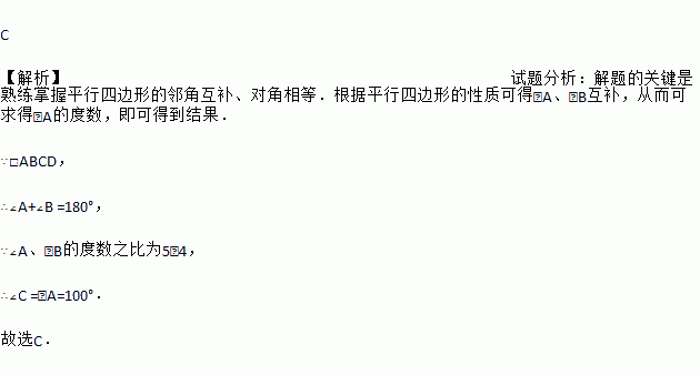 在□ABCD中,∠A、∠B的度数之比为5∶4,则∠C等于( )