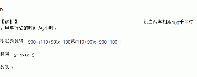 D 【解析】设当两车相距100千米时,甲车行驶的时间为x小时, 根据题意得:900?(110+90)x=100或(110+90)x?900=100, 解得:x=4或x=5. 故选D.