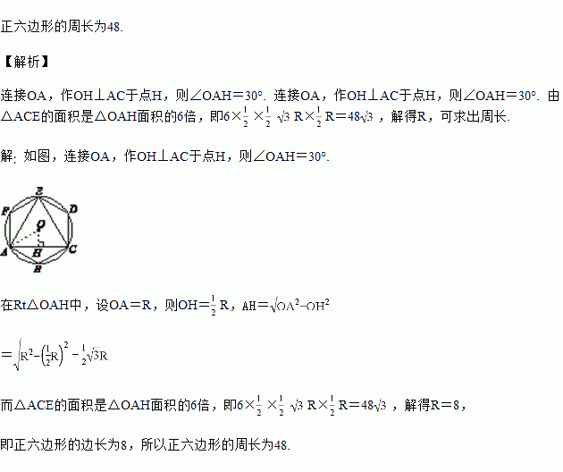 如图,正六边形ABCDEF内接于⊙O,若⊙O的内接正三角形ACE的面积为48 ,试求正六边形的周长.