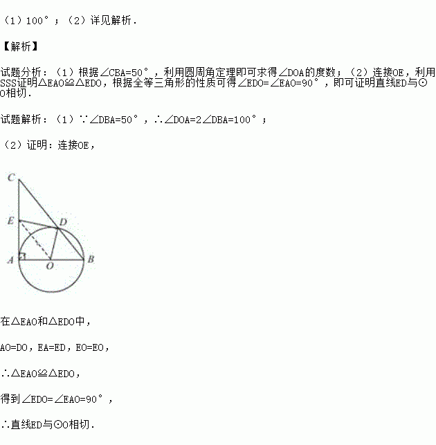 (8分)如图,在△ABC中,∠CAB=90°,∠CBA=50°,以AB为直径作⊙O交BC于点D,点E在边AC上,且满足ED=EA.