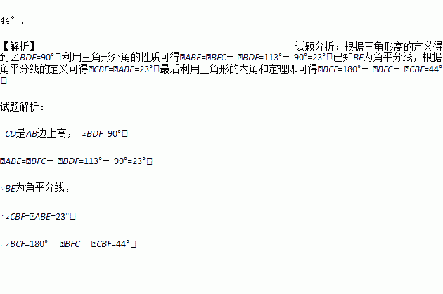 如图,在△ABC中,CD是AB边上高,BE为角平分线,若∠BFC=113°,求∠BCF的度数.