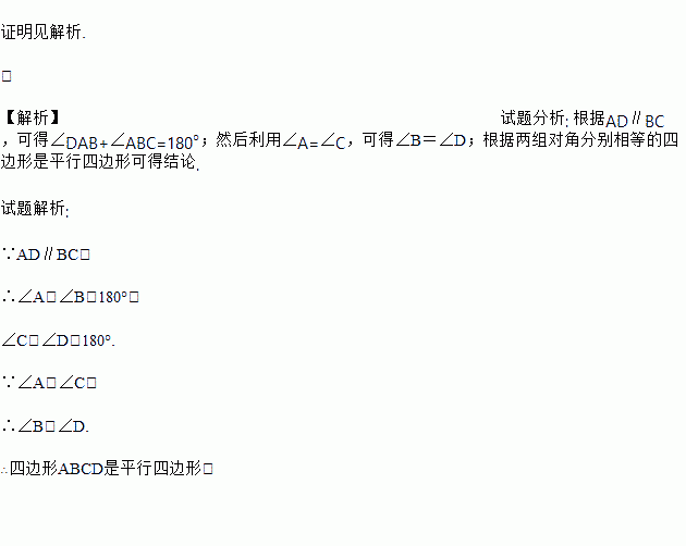 如图,在四边形ABCD中,AD∥BC,∠A=∠C.求证:四边形ABCD是平行四边形.