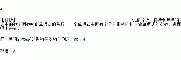 A 【解析】试题分析:直接利用单项式中的数字因数叫做单项式的系数,一个单项式中所有字母的指数的和叫做单项式的次数,进而得出答案. 【解析】 单项式﹣2xy3的系数与次数分别是:﹣2,4. 故选:A.