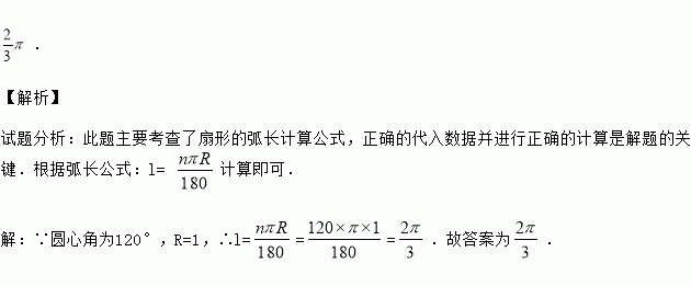 . 【解析】 试题分析:此题主要考查了扇形的弧长计算公式,正确的代入数据并进行正确的计算是解题的关键.根据弧长公式:l= 计算即可. 【解析】 ∵圆心角为120°,R=1,∴l===.故答案为.