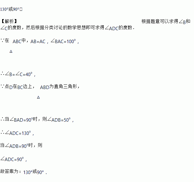 在△ABC中,AB=AC,∠BAC=100°,点D在BC边上,连接AD,若△ABD为直角三角形,则∠ADC的度数为_____.