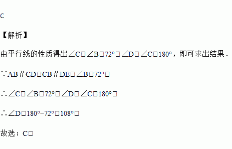 如图,AB∥CD,CB∥DE,若∠B=72,则∠D的度数为( )