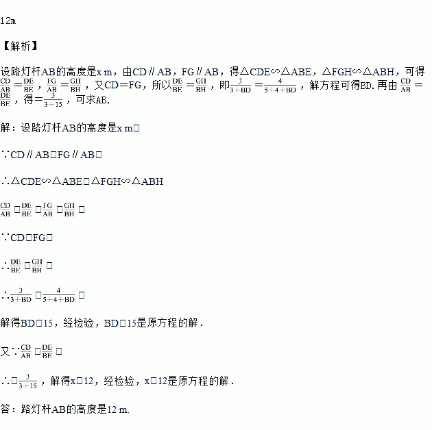 如图,花丛中有一路灯杆AB,在灯光下,大华在D点处的影长DE=3 m,沿BD方向行走到达G点,DG=5 m,这时大华的影长GH=4 m如果大华的身高为2 m,求路灯杆AB的高度.