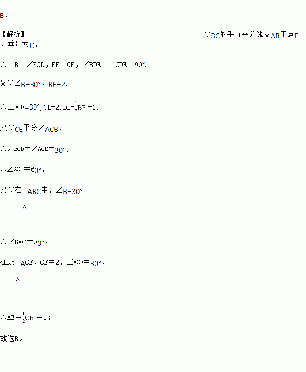 如图,在△ABC中,∠B=30°,BC的垂直平分线交AB于点E,垂足为D,CE平分∠ACB,若BE=2,则AE的长为( )