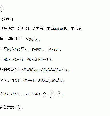 如图,在Rt△ABC中,∠B=90°,∠A=30°,以点A为圆心,BC长为半径画弧交AB于点D,分别以点A、D为圆心,AB长为半径画弧,两弧交于点E,连接AE,DE,则∠EAD的余弦值是______.
