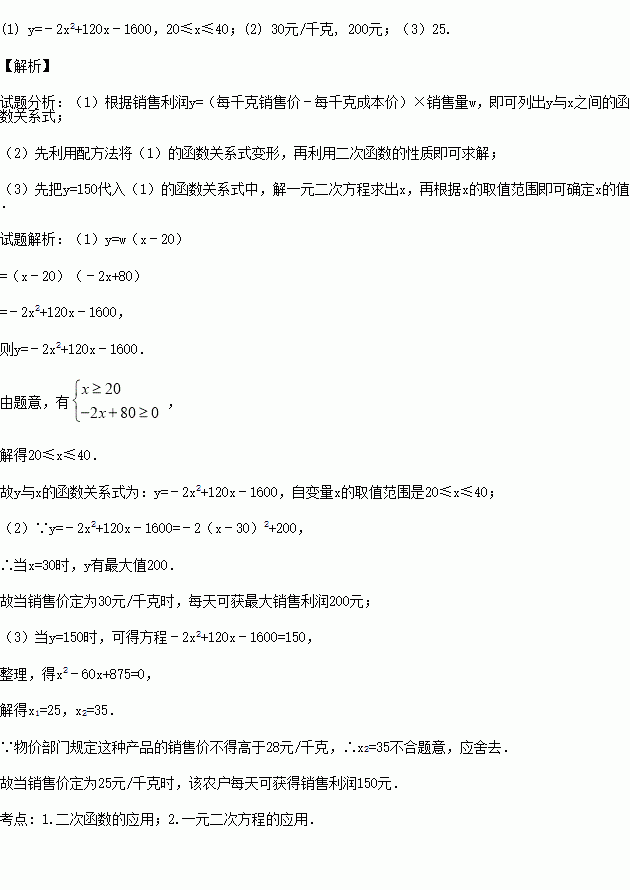 (3)如果物价部门规定这种产品的销售价不得高于28元/千克,该农户想要每天获得150元的销售利润,销售价应定为多少元?(参考关系:销售额=售价×销量,利润=销售额﹣成本)