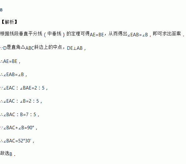 如图,若D是直角△ABC斜边上的中点,DE⊥AB,如果∠EAC:∠BAE=2:5,那么∠BAC=( )