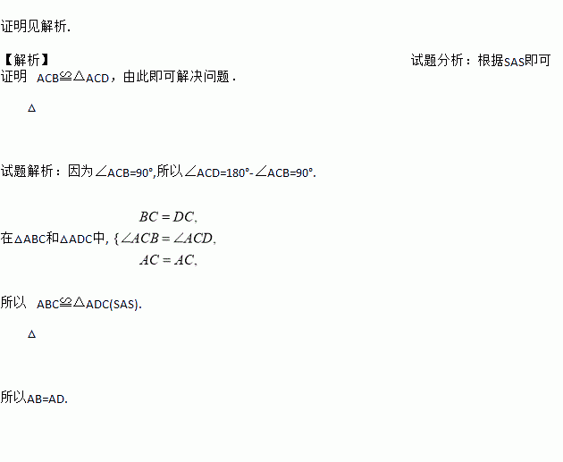 Èçͼ,ΪÁ˲âÁ¿³ö³ØÌÁÁ½¶ËA,BÖ®¼äµÄ¾àÀë,ÔÚµØÃæÉÏÕÒµ½Ò»µãC,Á¬½ÓBC,AC,ʹ¡ÏACB=90¡ã,È»ºóÔÚBCµÄÑÓ³¤ÏßÉÏÈ·¶¨µãD,ʹCD=BC,ÄÇôֻҪ²âÁ¿³öADµÄ³¤¶È¾ÍµÃµ½ÁËA,BÁ½µãÖ®¼äµÄ¾àÀë.ÄãÄÜ˵Ã÷ÆäÖеĵÀÀíÂð?