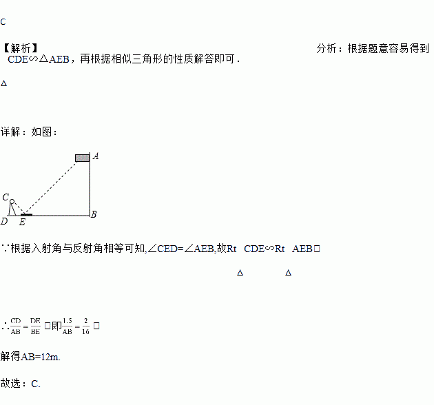 如图,小明在地面上放了一个平面镜,选择合适的位置,刚好在平面镜中看到旗杆的顶部,此时小明与平面镜的水平距离为2m,旗杆底部与平面镜的水平距离为16m.若小明的眼睛与地面距离为1.5m,则旗杆的高度为(单位:m)( )