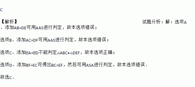 C 【解析】试题分析:【解析】 选项A、添加AB=DE可用AAS进行判定,故本选项错误; 选项B、添加AC=DF可用AAS进行判定,故本选项错误; 选项C、添加∠A=∠D不能判定△ABC≌△DEF,故本选项正确; 选项D、添加BF=EC可得出BC=EF,然后可用ASA进行判定,故本选项错误. 故选C.