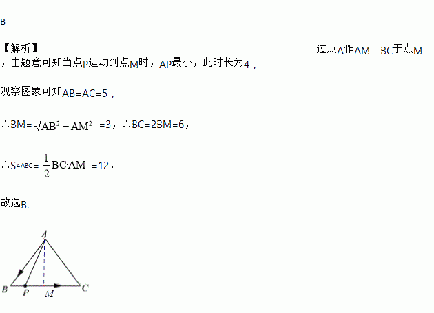 B 【解析】过点A作AM⊥BC于点M,由题意可知当点P运动到点M时,AP最小,此时长为4, 观察图象可知AB=AC=5, ∴BM==3,∴BC=2BM=6, ∴S△ABC= =12, 故选B.