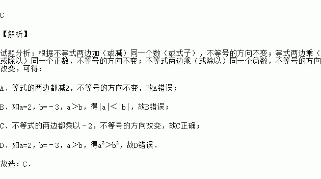 C.由a>b,得﹣2a<﹣2b D.由a>b,得a2>b2