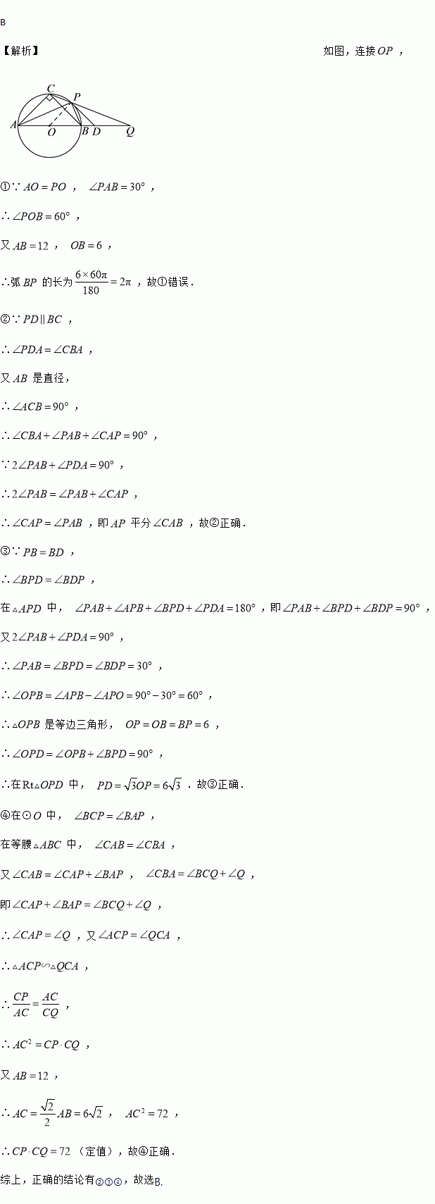 B 【解析】如图,连接, ①∵, , ∴, 又, , ∴弧的长为,故①错误. ②∵, ∴, 又是直径, ∴, ∴, ∵, ∴, ∴,即平分,故②正确. ③∵, ∴, 在中, ,即, 又, ∴, ∴, ∴是等边三角形, , ∴, ∴在中, .故③正确. ④在⊙中,...