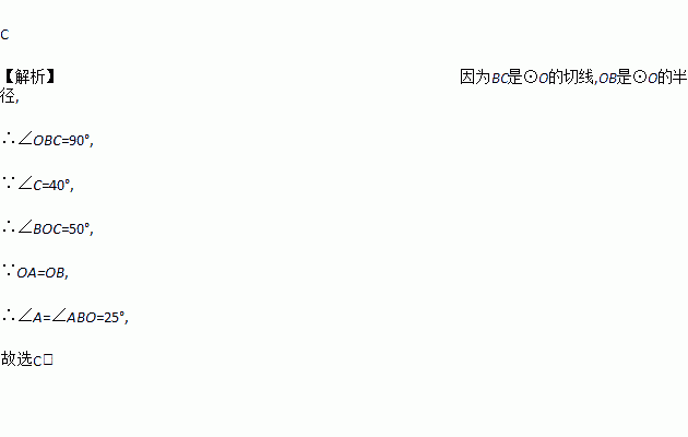 如图,AB是⊙O的弦,AO的延长线交过点B的⊙O的切线于点C,如果∠C=40°,则∠ABO的度数是( )