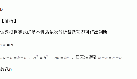 A. a+c=b+c B. a2=b2 C. ac=bc D. a-c=c-b