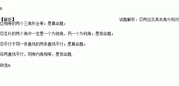 给出下列5个命题:①两边及其夹角分别对应相等的两个三角形全等;②互补的两个角中一定是一个为锐角,另一个为钝角;③平行于同一条直线的两条直线平行;④两直线平行,同旁内角相等.其中真命题的个数为( )